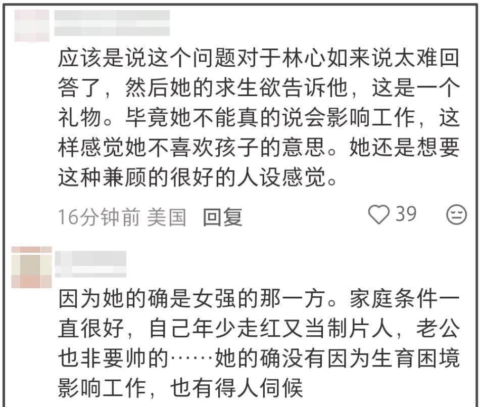 林心如在婚姻中保持着强烈的独立性,邓莎透露老公不陪自己产检,林心如打心眼里不理解邓莎的委屈,某种程度上,林心如在婚姻中是作为邓莎老公角色存在的。